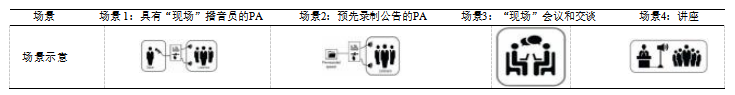 需要STI測試的可能場景有4種,如表3所示,其中確定了傳輸通道、說話者和收聽者。場景1與場景4基本相同,都是測量時說話者通過傳聲器到擴聲系統,再由揚聲器系統發聲,只是場景1中說話者與聽者不在一個房間(場所),而場景4中說話者與聽者同在一個房間(場所),所以下面分3種場景進行介紹。在STIPA測試期間,所有的說話者都被STIPA測試信號源所取代,所有的聽者(和聽者的位置)都是所用STIPA分析儀的測試位置。