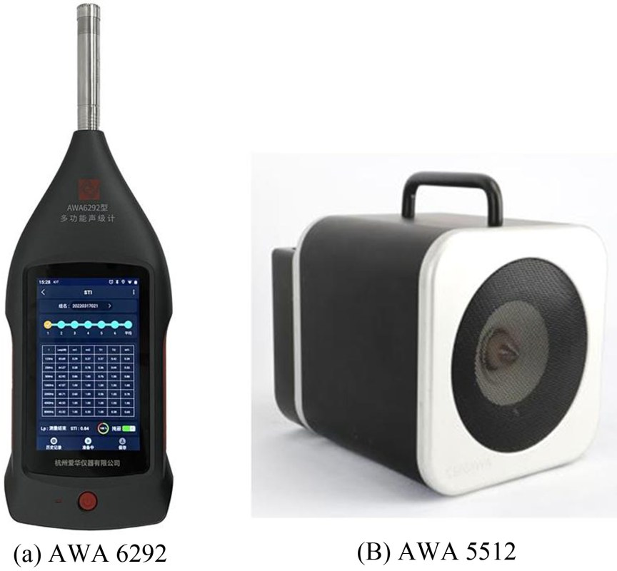 AWA6292型多功能聲級計如圖2(a)所示,是采用數字信號處理和物聯網技術的新一代手持式聲學測量儀器,性能符合GB/T 3785.1/IEC 61672-1對1級聲級計和GB/T 3241.1/IEC 61260-1對1級濾波器的要求,可以選擇工業噪聲測量、環境噪聲測量、職業衛生噪聲測量和建筑聲學測量等模塊。當選用建筑聲學測量模塊時,配置總值積分測量、倍頻程和1/3倍頻程濾波器、混響時間測量和STIPA測量等軟件模塊,可以完成大多數建筑聲學測量項目,尤其適用于廳堂和室內場所的聲學和擴聲特性測量。