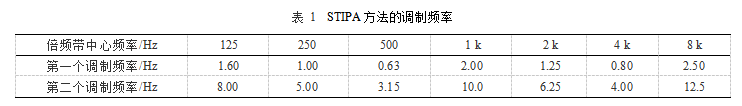 STIPA是完整STI的一種簡化形式,稱之為公共廣播系統語音傳輸指數。它是基于使用較少數量的調制指數進行的測量。STIPA測試信號僅由1個測試信號組成,在7個倍頻帶中的每一個波段都預設兩個調制如表1所示。這14個調制指數是同時產生的。一次測量時間僅需15~25s,比完整STI要短得多,是直接方法的主要應用途徑。調制指數也可以使用間接法得出,稱為STIPA(IR)。